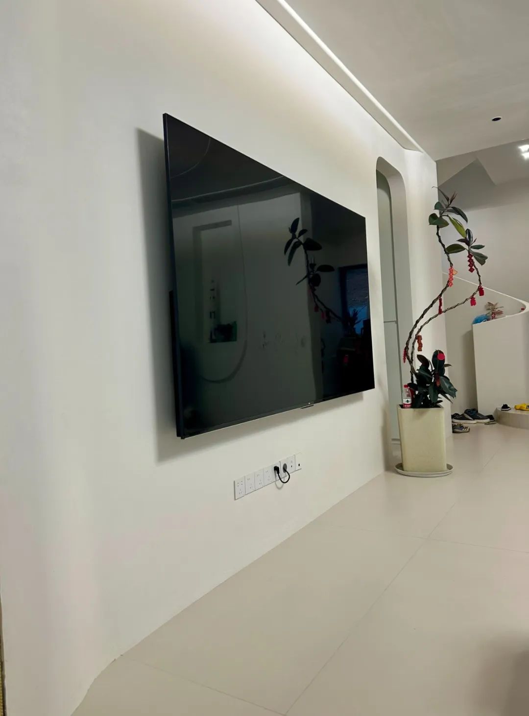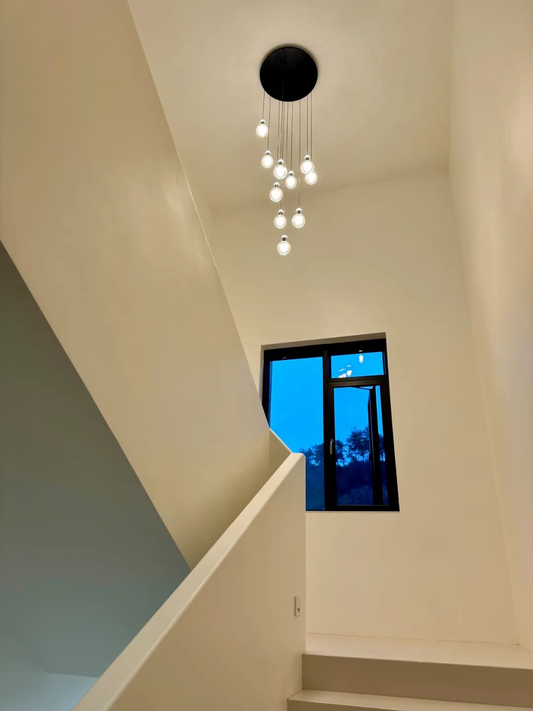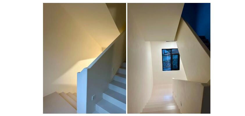 楼梯极简又灵动的线条完美地体现出艺术涂料的质感与品质,如音符般跳跃的灯饰,为空间注入一抹活力。